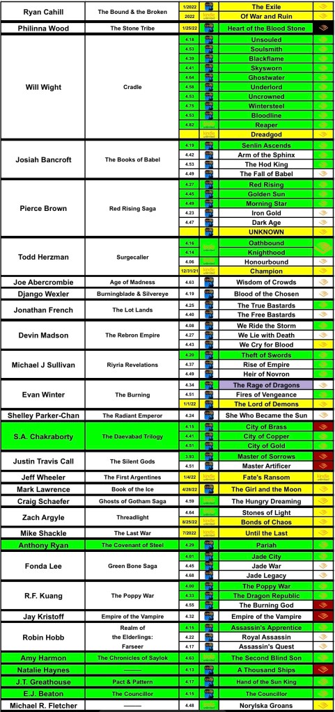 I have a bunch of popular authors that I plan to get to this year like Will Wight, Josiah Bancroft, Pierce Brown, S.A. Chakraborty, Michael J Sullivan and many more that I’ll be happy to finally say “yes, I read these books and I love them!” I’ll also be adding and removing books on my list throughout the year, so I’ll actually only read about 50% of what’s on my current 2022 TBR list. (Pictured at bottom of page)