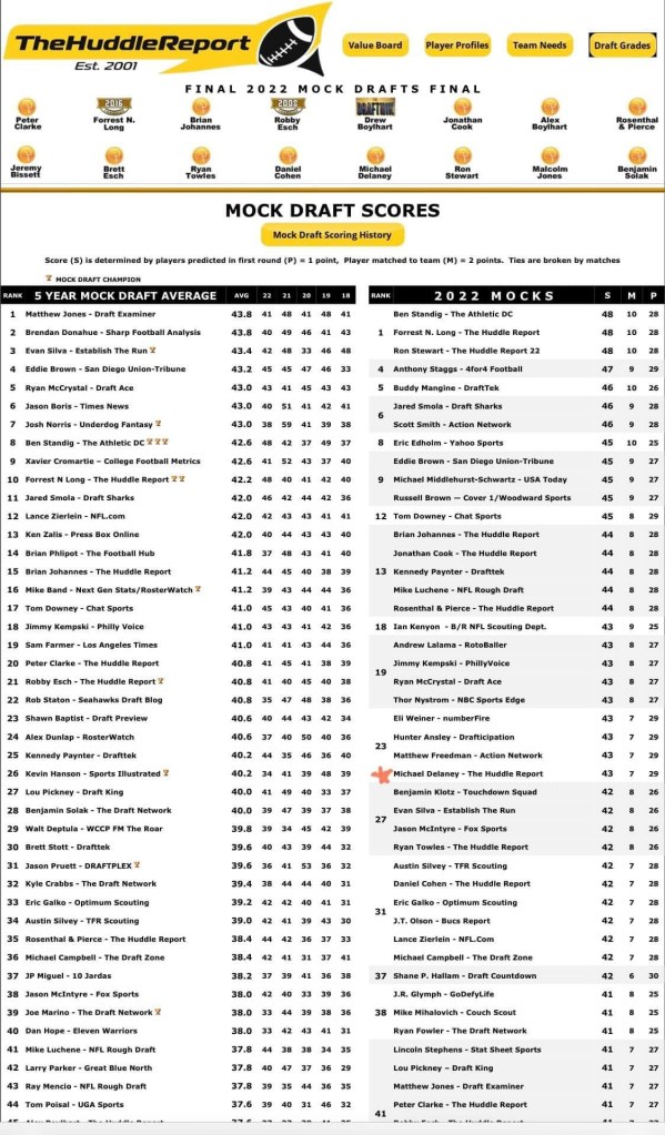 Ben Standig, Forrest N. Long and Ron Stewart tied for most accurate mock: 48 of 96 (50%).