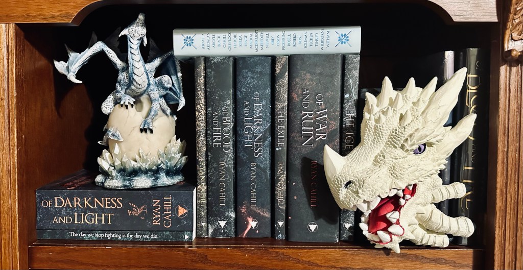 Cahill masterfully crafts a multitude of unforgettable characters and making each one matter—even the minor cameos of some loved individuals within the fantasy community. I loved seeing all of my favorite characters and seeing their evolution from book 1 until the end of book 4. As much as I love Calen and Valerys and how much they have grown into such an incredible man and wonderous dragon, to Dahlen’s evolution as a character, the incredible Ella & Faenir, my undeniable favorites, Dayne and Belina, who shine every moment they get and the multitude of other characters in the world. Yet, I couldn’t help but think about Dann the most, I’ve always enjoyed him, but Of Empires and Dust made it clear that he’s not just comedic relief, he is the glue binding them all together.