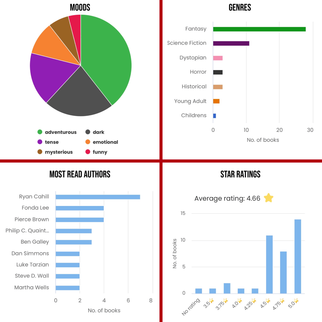 I love StoryGraph for its charts. It does such a good job of keeping track of things like mood, average rating, most read and genres, like the pictures below!