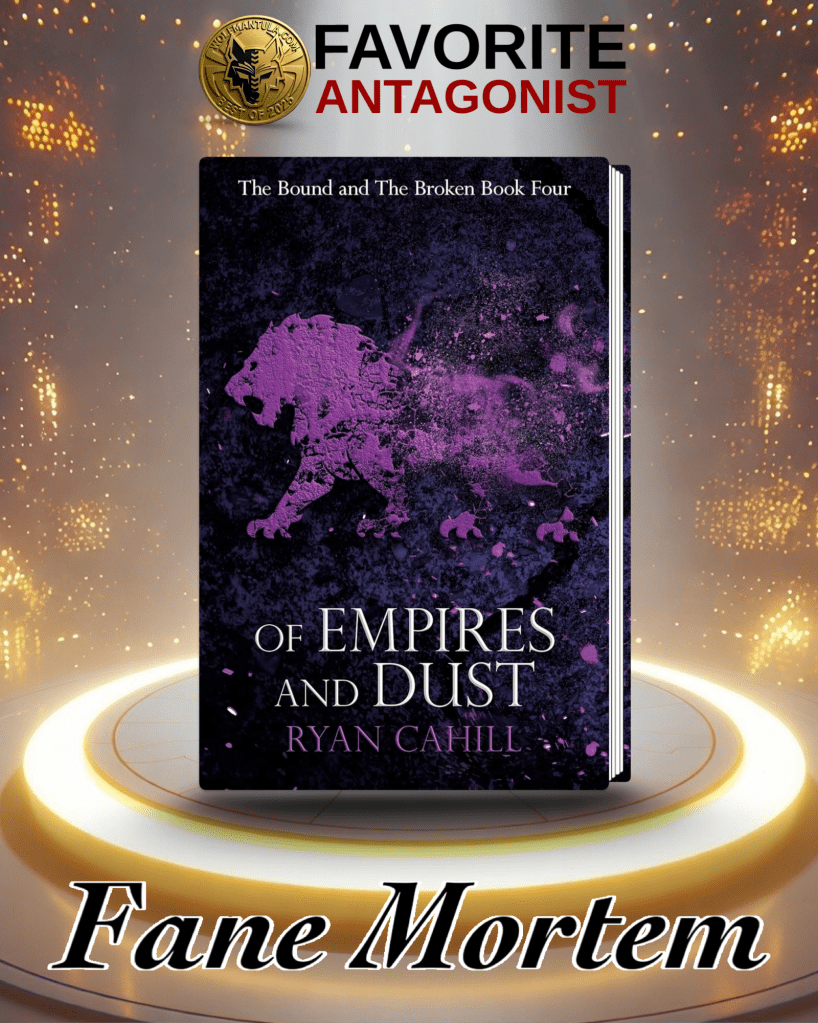 This was not an easy decision for me to make, because Of Empires and Dust possesses a few characters that could claim the crown. Fane Mortem is just one of those characters that sends chills up your spine, he’s the evil you see, the evil leading the war against the nation… even though he’s not the evilist of the evil in this series.